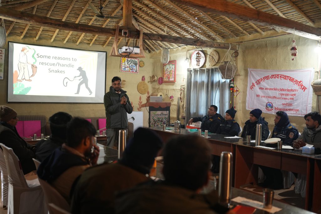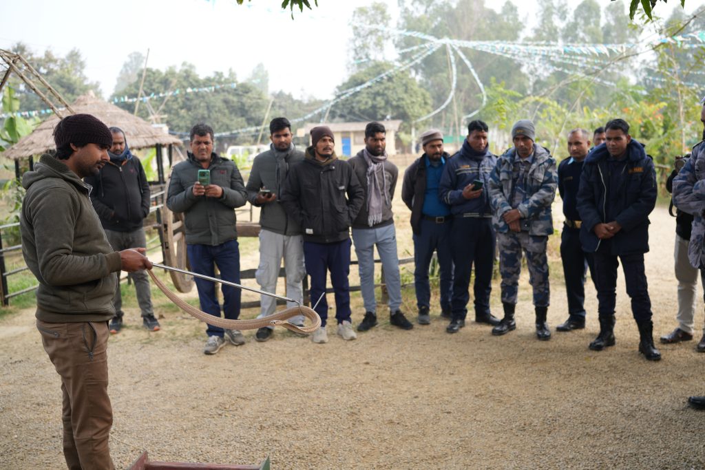 Participants from Nepal Police, Armed Police Force (APF), and forestry officials received hands-on training in safely handling both venomous and non-venomous snakes, identifying different species, and responding calmly during rescues. Their enthusiasm, discipline, and eagerness to learn made the training highly effective.